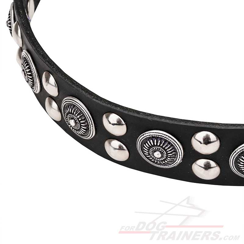 First of all, pay attention to the decoration of the item. It is amazing, isn't it? Large silver-like circles and round studs definitely catch an eye at the first glance. Being secured with small rivets, the decoration will not fall off even after a long term of use. All metal parts of the collar are resistant to rust and corrosion. They will shine like new for many years, attracting attention of every passer-by while walking your pet down the street.
