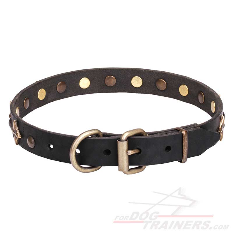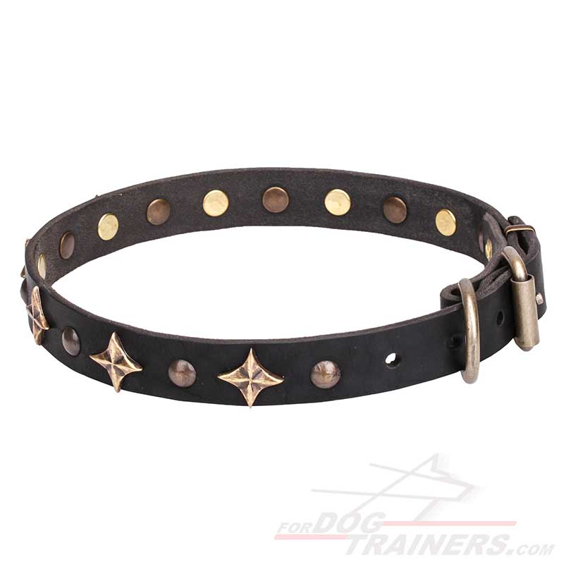 Do you wish to show everyone in the park that your dog is a real "King" of style? It is as easy as pie! Put this wonderful Genuine Leather Canine Collar decorated with old bronze-plated stars and studs on your four-legged friend and enjoy the admirations of people around! The one row of shining stars and small half-ball studs will leave nobody indifferent. Don't you think that this adorned collar will look amazing on your pet's neck? Besides, the item is only 1 inch (25 mm) that makes it comfortable for everyday walking even for long distance. Choose only high-quality equipment for your Canine and make him happier every minute! It is a very interesting offer for your pet, isn't it?