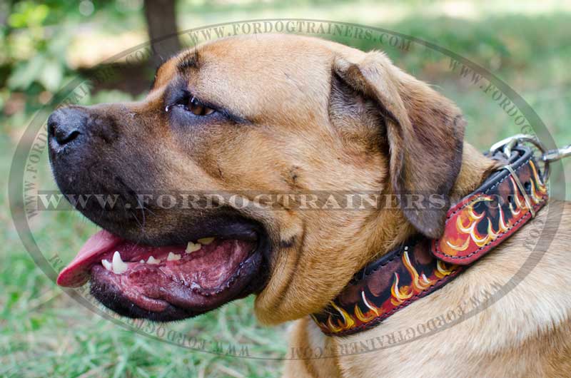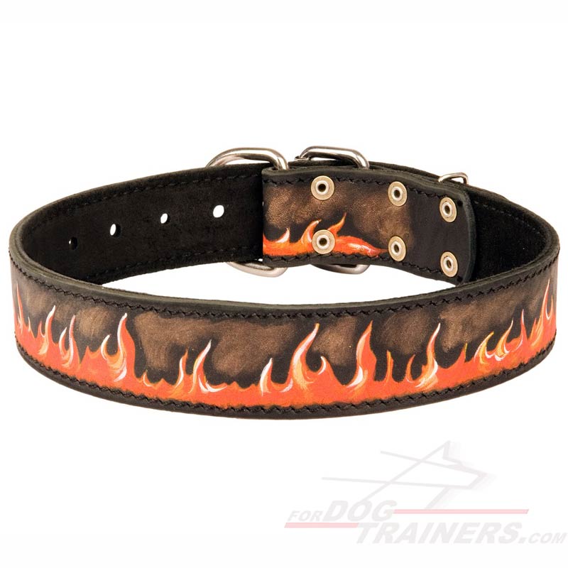 Dear dog owner, what do you think about, when sitting next to the fireplace? Maybe you feel warmth coming from it and think about pleasant things. Maybe you think, that fire is dangerous and it's better not to come close. Your dog, wearing this Leather Collar with Painted Flames may be in a figurative sense like a fireplace. He warms your heart for sure, but he is dangerous for others at the same time. This Leather Collar accentuates both these features of your doggy. Your dog will love you even more, wearing this Gorgeous Leather Collar!