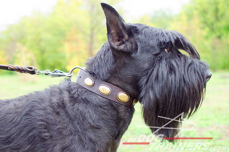 Walking Dog Collar for Riesenschnauzer with Brass Plates Handset
