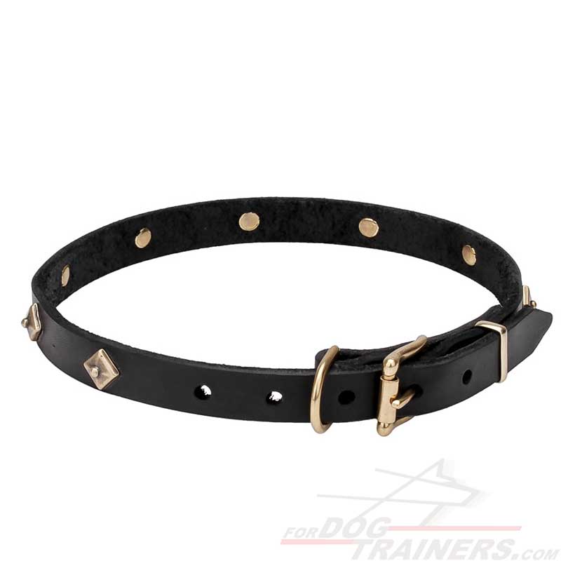 Massive collars are not for your dog? You don't want to overload your pet's neck with heavy items while everyday walking, do you? Then, try this Narrow Leather Dog Collar adorned with brass rhombs. Despite the fact that this collar is decorated with metal elements, special narrow design of the item makes it light in weight and very comfortable to wear. Hurry up to order this amazing gear and let your dog feel the difference! Say "No" to bulky collars!