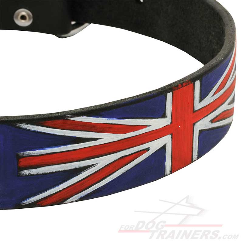 This dog walking collar is made of safe, pure leather and equipped with the strongest nickel-plated hardware. D-ring is for comfy lead attachment. Nickel-plated convenient buckle is for easier usage and metal clip is for holding leather tip of the collar. This item is designed for British Patriots. The paint is applied manually. It is safe and water-resistant. Neat and stylish look of your dog is guaranteed.