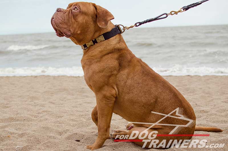 Adorn your pet with this War-Like Leather Dog Collar with vintage brass plates and nickel pyramids. This tool will become very handy for walking and even basic training of your doggie.