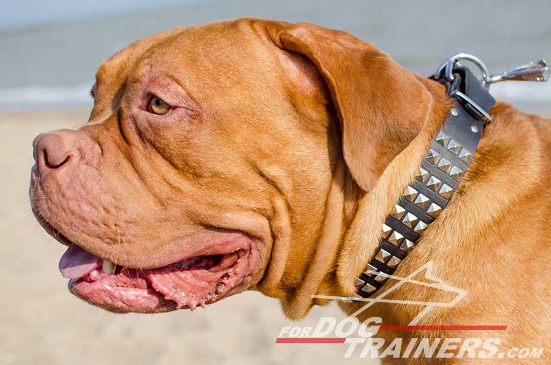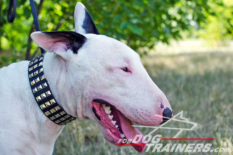 • Wide Leather Dog Collar with 3 Rows of Nickel-plated Pyramids