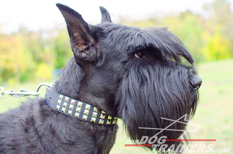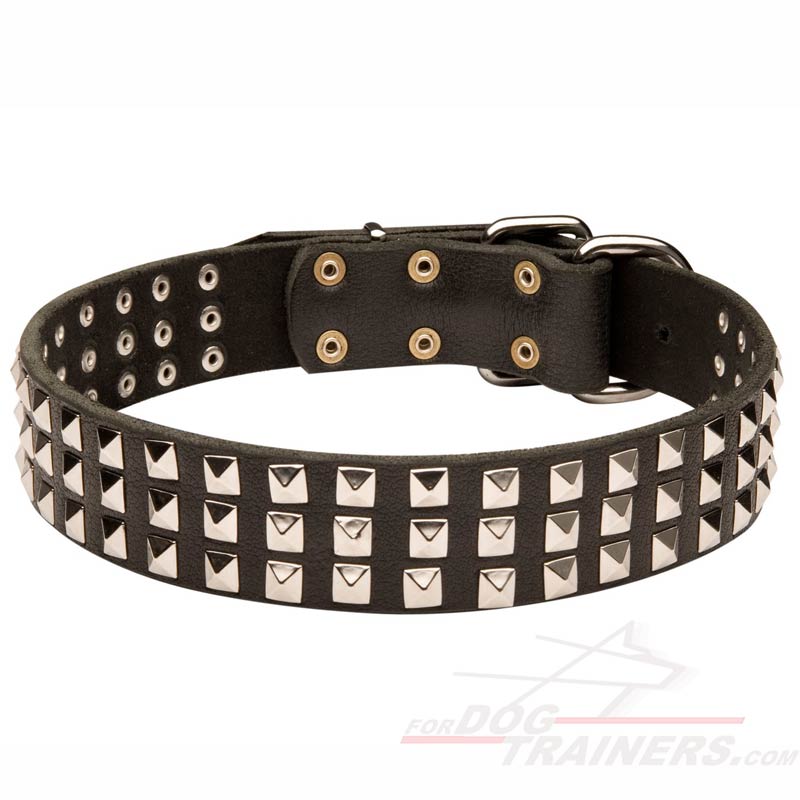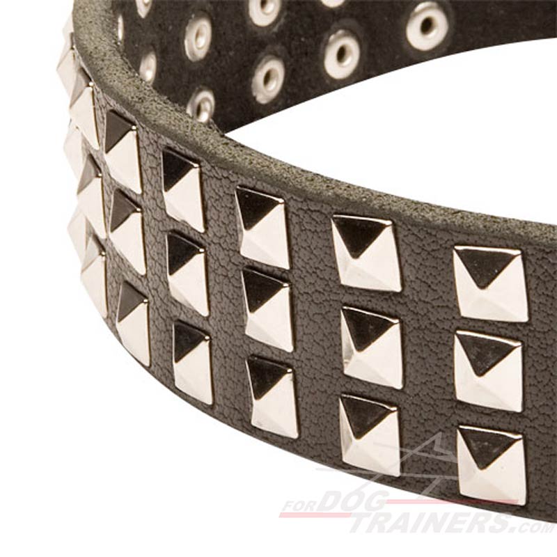 Wide Leather Dog Collar with 3 Rows of Nickel-plated Pyramids