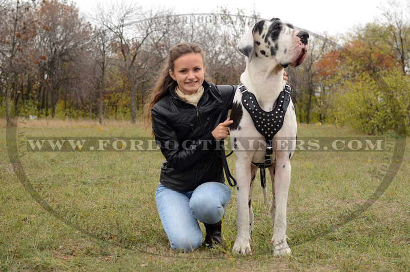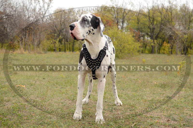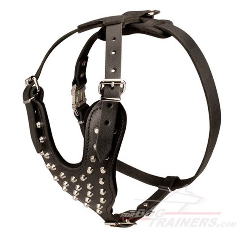 Easy to Fit Leather Dog Harness with Studded Padded Chest Plate