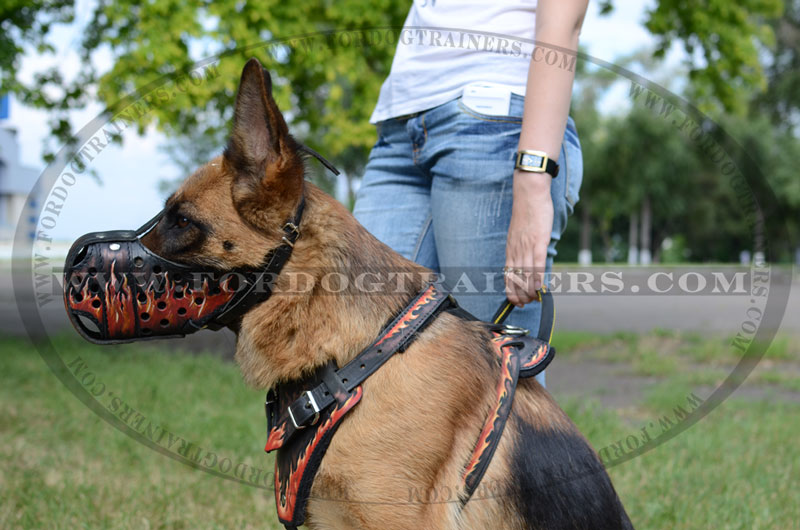 Looking for comfortable for your dog muzzle that will be practical for training, traveling, patrolling, guarding and visiting the vet? Order now our "Flames Painted" Leather Dog Muzzle for your pet. This muzzle will protect you and your pet from some unpleasant events.