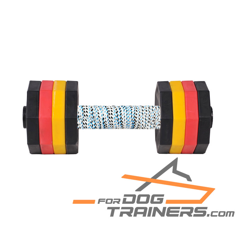 Start your dog training program with the lightest weight, gradually increasing the challenge for your dog. It is possible due to 4 pairs of removable weight plates. It is extremely easy and doesn't take much time to fix securely the necessary amount of plates. You buy only one item but receive the tool of numerous options and possibilities. Almost indestructible weight plates are made of plastic that will not break after regular retrieving training. Bright colors of the dumbbell add fun and enjoyment to your pet exercising.