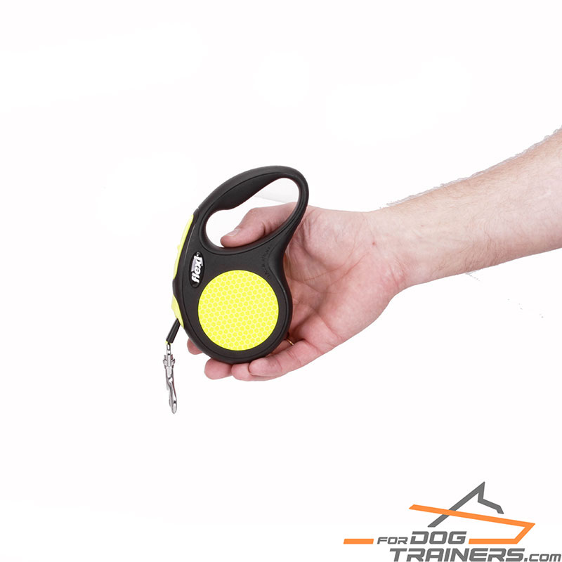 The leash is very comfy for the handler as it is equipped with an easy grip handle. It is designed to fit the hand and provide firm holding. The gear is lightweight and doesn't require much force applied to hold it. It consists of plastic housing and flexi tape, made of waterproof nylon. This practical and waterproof material is considered one of the best, as it requires minimal efforts to clean and maintain. Moreover, the tape has a bright yellow color, which will reflect the light, bringing better visibility and safety at the dark time. That works great, especially if you like to go your pet out at night.