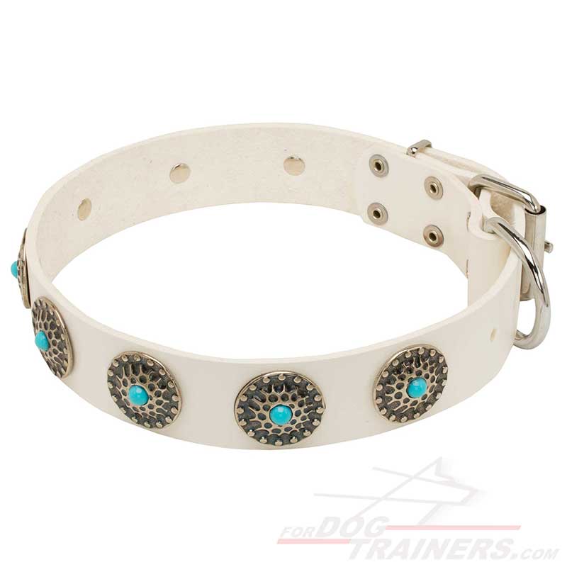 Original things always attract attention. The majority of people just can’t be indifferent to anything, that looks unique and stresses on good taste. We are happy to present you our New White Leather Dog Collar with blue stones. This fashionable Collar combines superb quality and awesome appearance - two features, that make any Dog Collar a favourite everyday accessory for different activities. Your dog won’t look gorgeous only on special occasions! Wearing this Leather Collar he will always look beautiful!