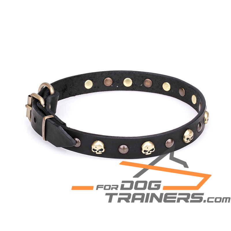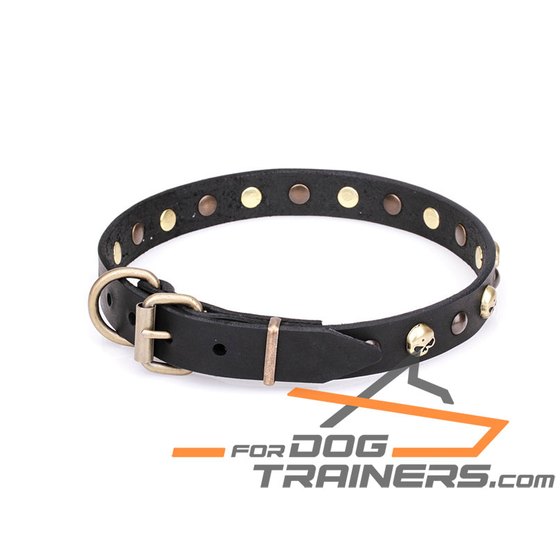 This Dog Collar is decorated with brass plated studs and skulls. They are highly resistant to rust and corrosion, so you can be sure that they will keep their color and shine for many years. The combination of old bronze antique half-ball studs and bright gold-like skulls make the supply look fashionable. Let other dog owners envy your pet!