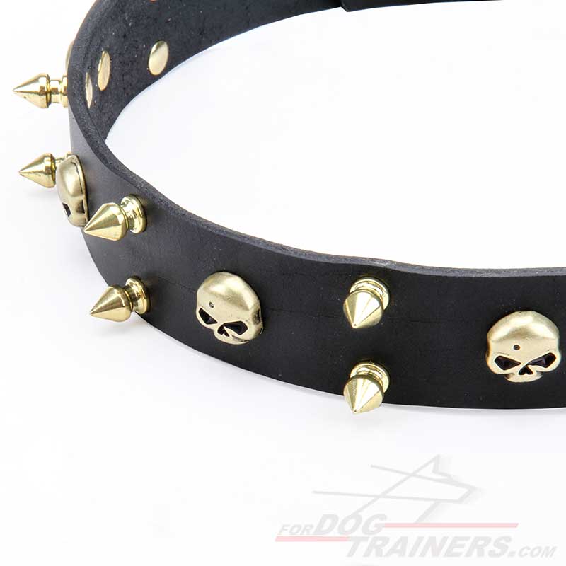 Brass Spikes and Skulls on 30 mm Wide Leather K9 Collar