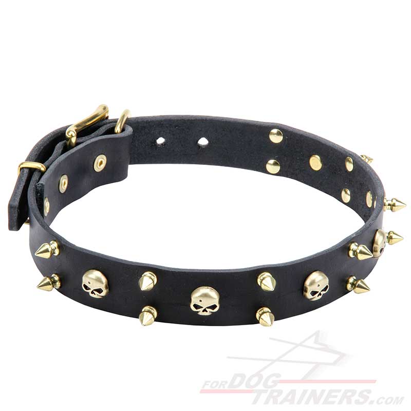 The decoration of the collar also merits your attention. Here, you can see a perfect combination of rust resistant gold-like spikes and small skulls, carefully riveted to the leather strap to hold for many years. Being produced in black, brown and tan, each color of the item perfectly harmonizes with a shiny brass hardware. Besides, the classic buckle and D-ring for leash attachment are also made of brass and will serve you for decades.