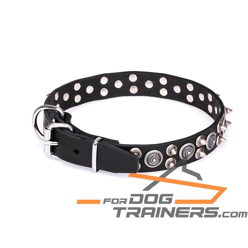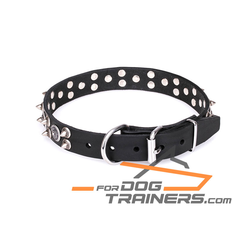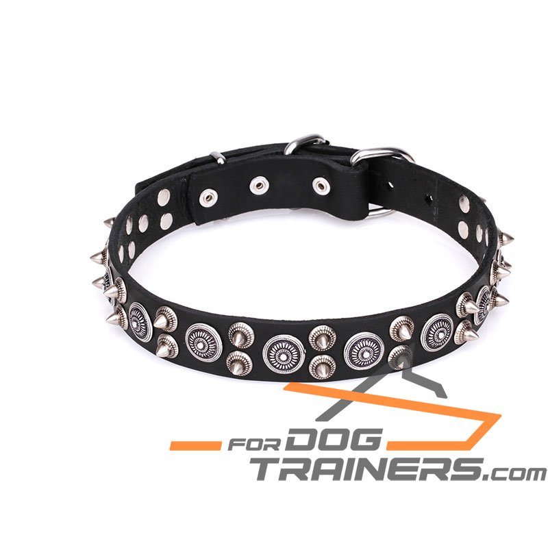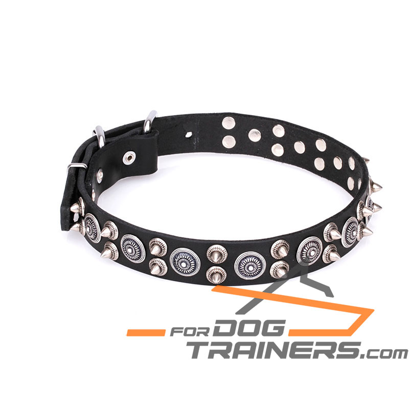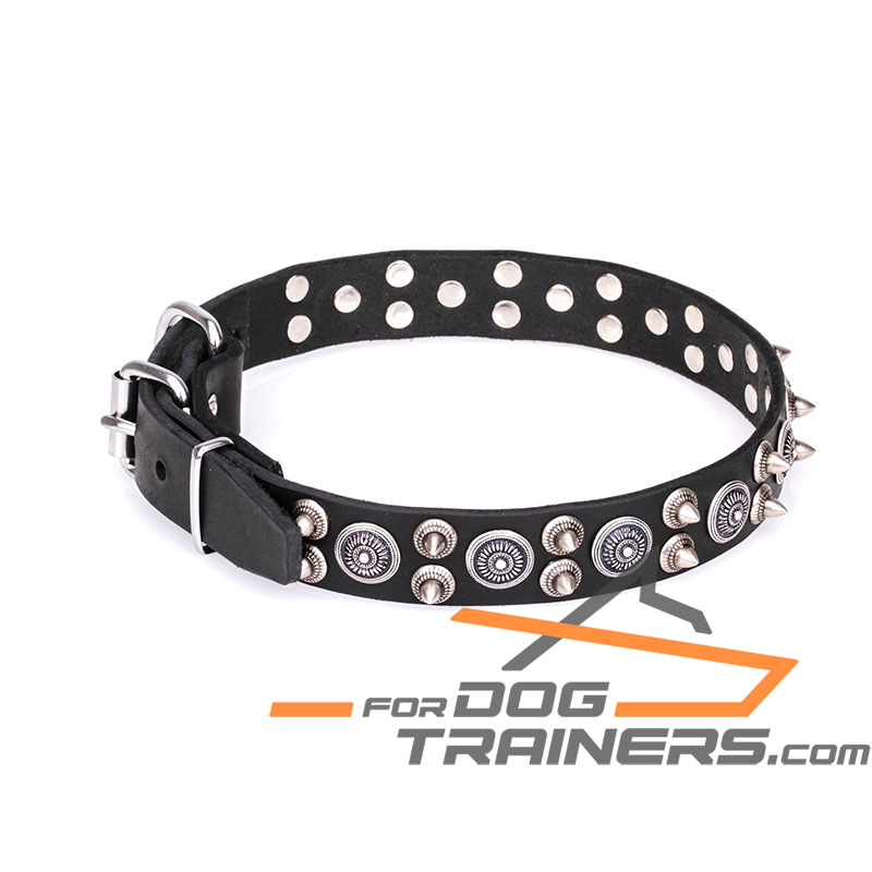 This high-quality trendy dog collar is a nice way for you to show your love to your canine! This exciting leather collar has elaborate design. Beautiful silver-like plated studs are combined with sharp-looking spikes creating unforgettable impression. All your neighbors with their pets will envy your gorgeous doggie. In addition, this accessory is manufactured of genuine leather and completed with durable hardware. Provide your canine with beauty and quality, choose this exclusive leather dog collar!
