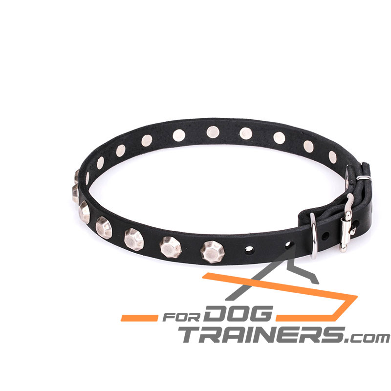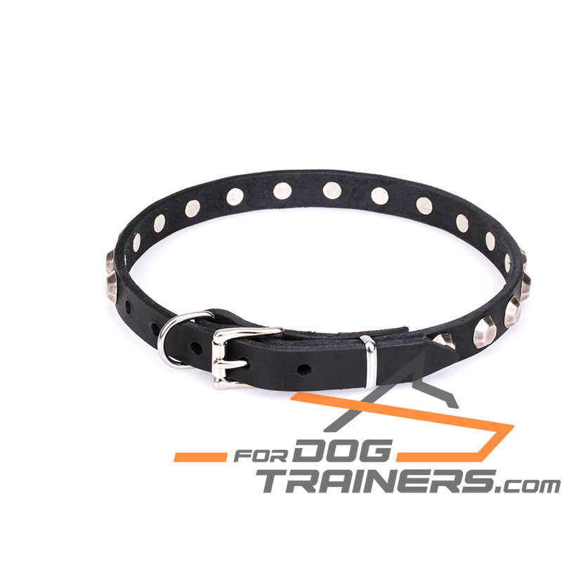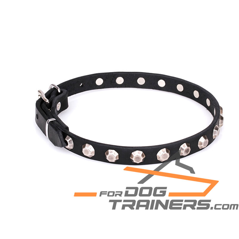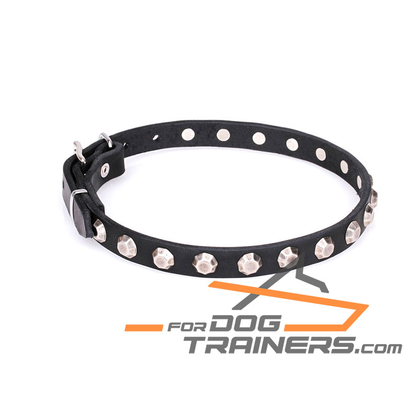 Are you excited when your dog looks doggone cute? Make his outfit more fashionable with this Studded Leather Collar! This accessory has a narrow leather strap and sits comfortable on the pet's neck. Delicate design provides great convenience and trendy look for the canine. The gear is decorated with faceted silver-like plated pyramids which are riveted for longer durability. It's wear-tested for strength and long service, so the collar has prolonged lifespan. Chrome plated hardware increases reliability of the item giving you a chance to walk and train your doggie in safety. Think of buying exactly this handcrafted leather collar, hurry up to order it now for your favorite dog!