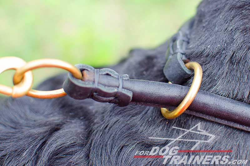 This product is an excellent accessory for comfortable and health-safe obedience training of your dog. This choke collar is as effective as metal chain, but unlike the choke chain, this collar is softer and therefore more pleasant for the dog. This piece of training equipment is manufactured of rounded genuine leather material carefully stitched for better functionality and service. Equipped with extremely durable brass rings, the collar provides reliable service, has long life span and comfortable design. Try this Round Choke Dog Collar and obedience train your dog in dog-friendly equipment!