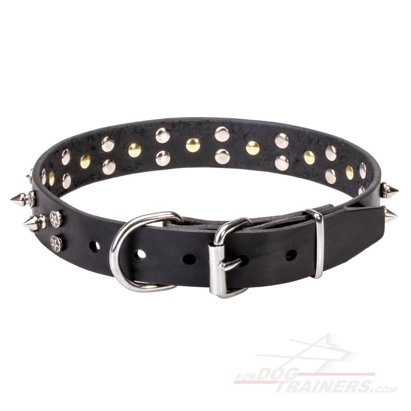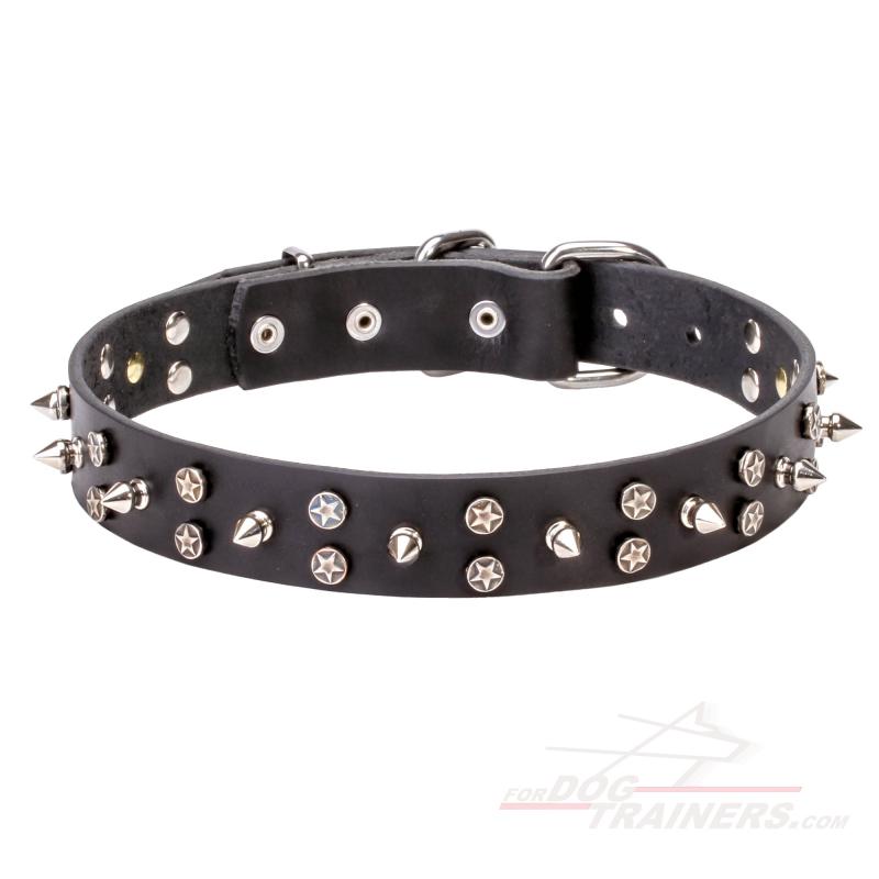Wearing this dog collar on, your furry friend will surely be in the center of attention. The perfect look of your pet is guaranteed due to the decorative elements that are carefully riveted around the collar face. The best combination of chrome plated spikes and stars will make your dog look like a "Super Star".