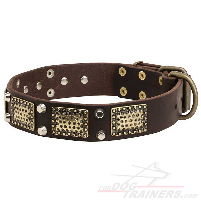 Pure Leather Dog Collar with Vintage Brass Plates and Nickel Studs