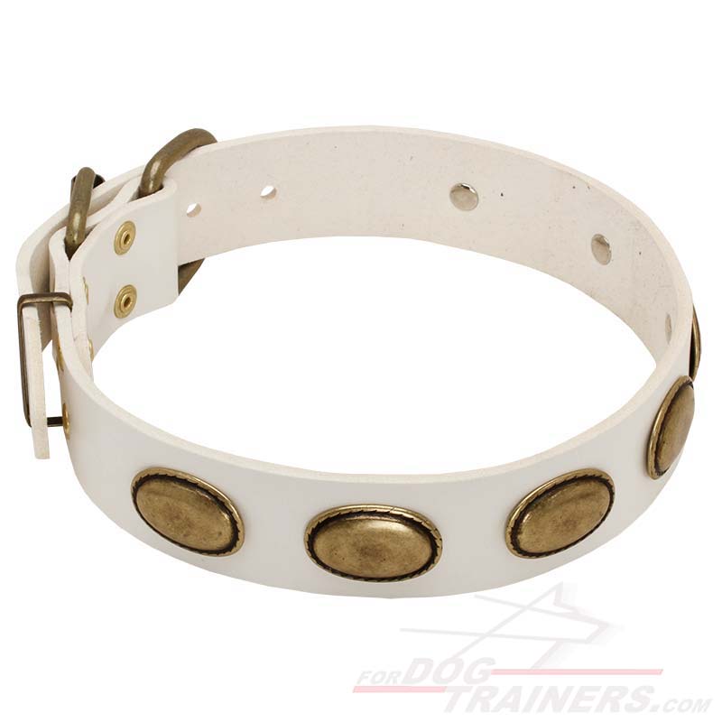 All plates as well as fittings of the Collar are made of brass. What are advantages of this metal? First of all, it looks like gold, thus everybody will wonder how you managed to get so luxurious Collar for your precious dog. Secondly, this metal is rust proof, so the decoration, D-ring and buckle will look like new for many years.