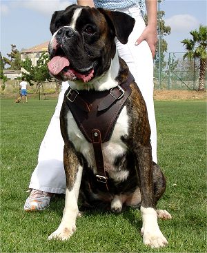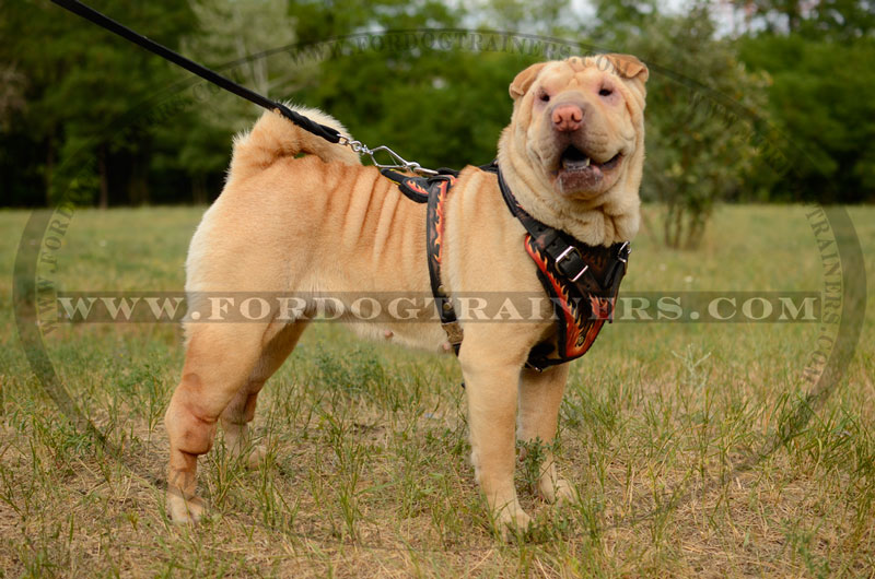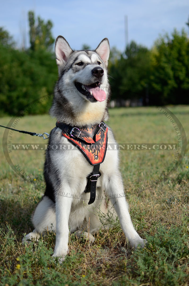 Get this Attack Dog Harness with handpainted flames on the chest. This dog training harness is comfy and reliable.