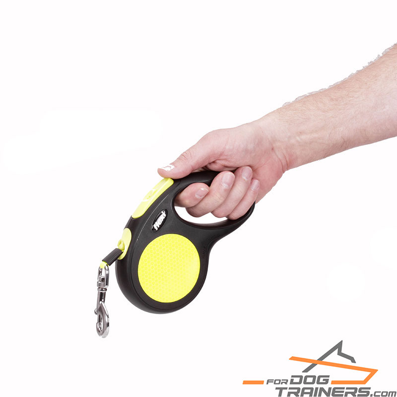 This Flexi Leash is created to allow you better control during walking your pet. One-handed short-stop braking system, which guarantees a reliable handling and comfortable use, is an obvious advantage of this model. Due to slight tension on the tape leash and the one-hand braking and recoil system you can always keep your dog under control. You can easily regulate how much of the tape is extended and adjust its length to find an ideal safe distance between you and your canine. Click lock button fixes the length you need.