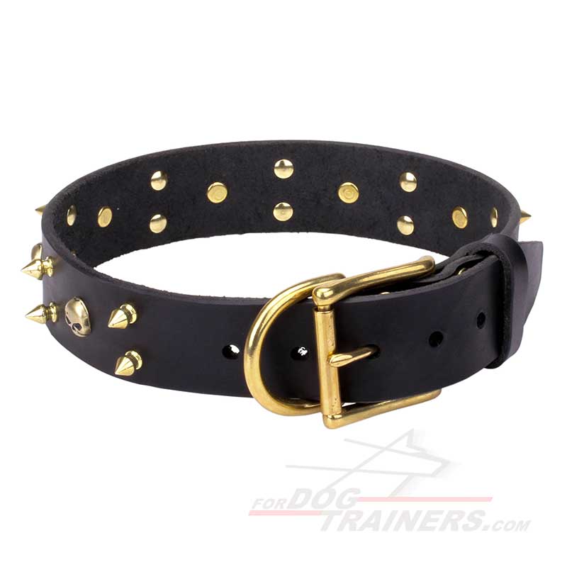 You are searching of an adornment for your dog that will accentuate his brutality as well, aren't you? Dog collars with skulls are not a novelty on the dog equipment market. Though, have you seen many collars with skulls and spikes? Probably, not! This fact makes the leather collar presented on this page a unique supply. It reflects your own style of life and works great for controlling your pet. Besides, golden-like brass spikes and skulls look beautiful on your canine's neck. Wide royal leather collar with exclusive decorations is what you are looking for!