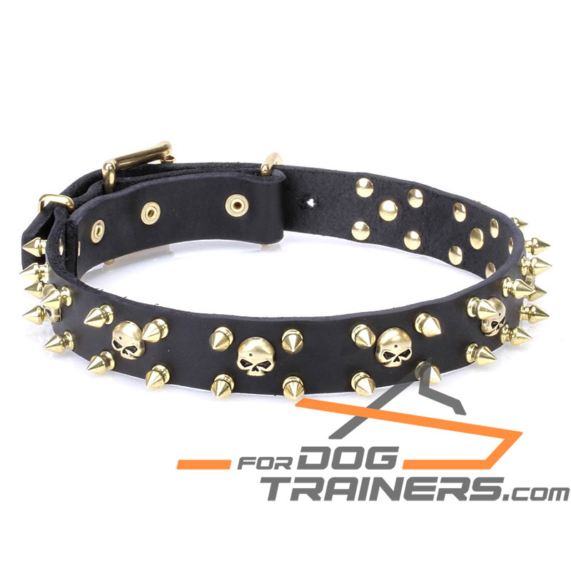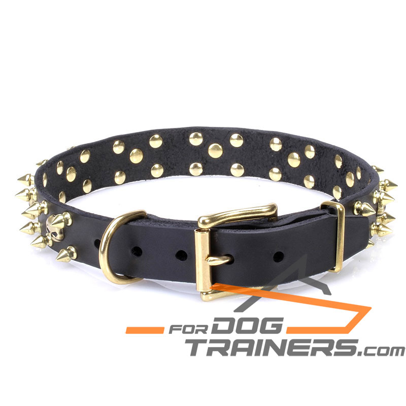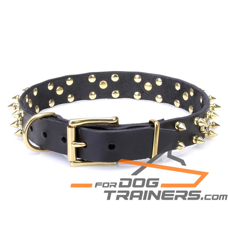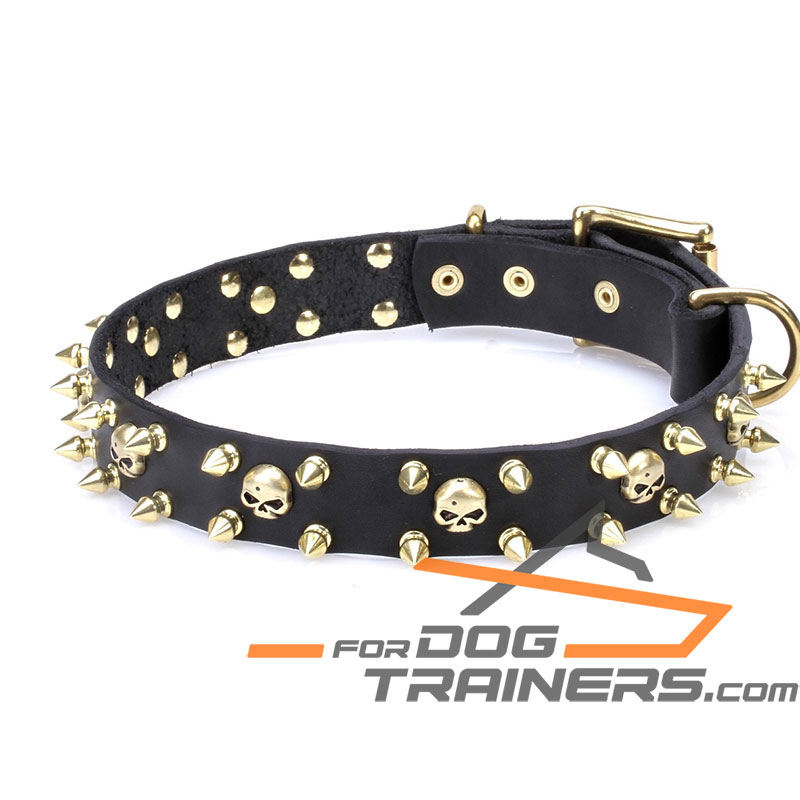 Designer Dog Collar with Brass Spikes and Skulls