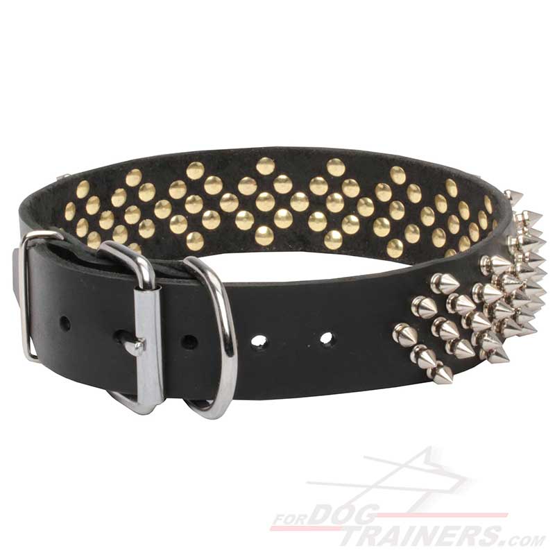 Specially arranged spikes have two functions. First of all they serve as a decor. But also, these spikes may become a protection for your dog. In case your dog is attacked by another dog, your pet's throat can be protected due to the spikes. They won't allow another dog to bite the neck in the area where your dog wears it. And as you know, throat is one of the most vulnerable parts of the body. So, it is very important and is one more key feature of this fashion dog collar.