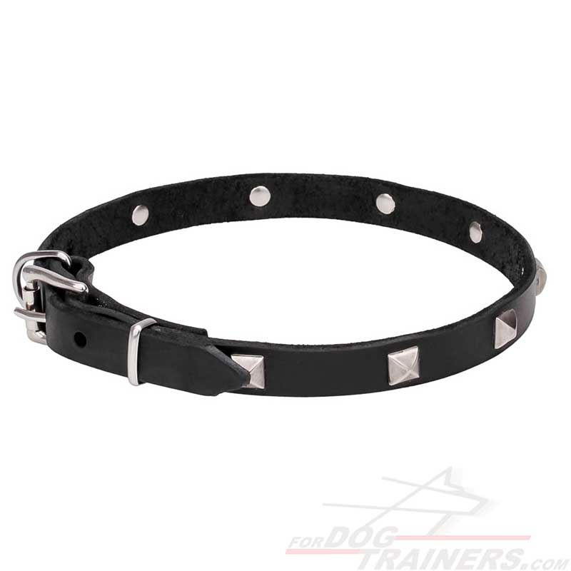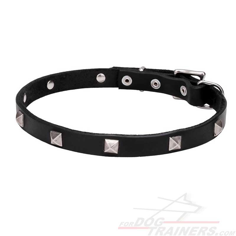 Trendy Leather Dog Collar with Shiny Chrome Plated Pyramids