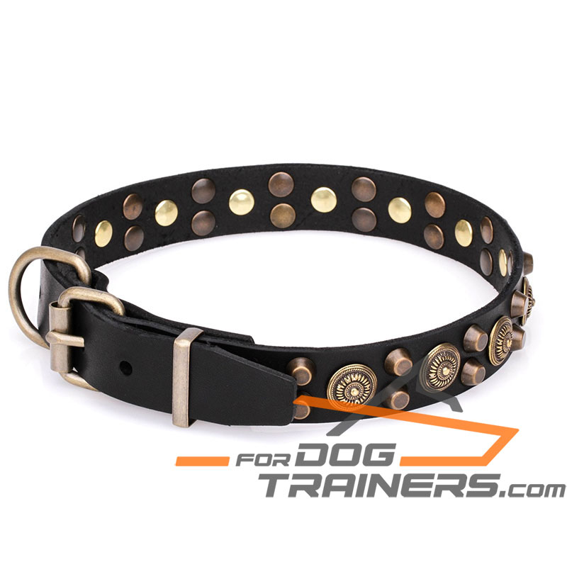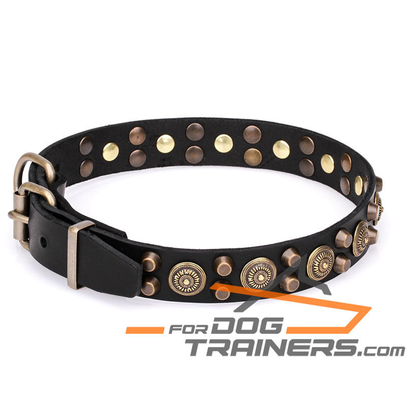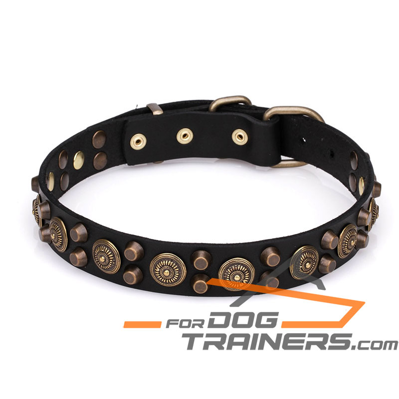 Attractive old-bronze covered adornments look magnificent on any color you choose, whether it is black, brown or tan. Enjoy everyday walking with your pet, when he wears his favourite dog collar!