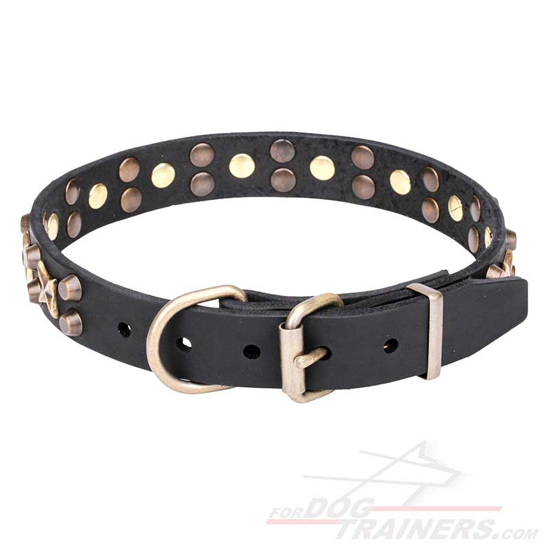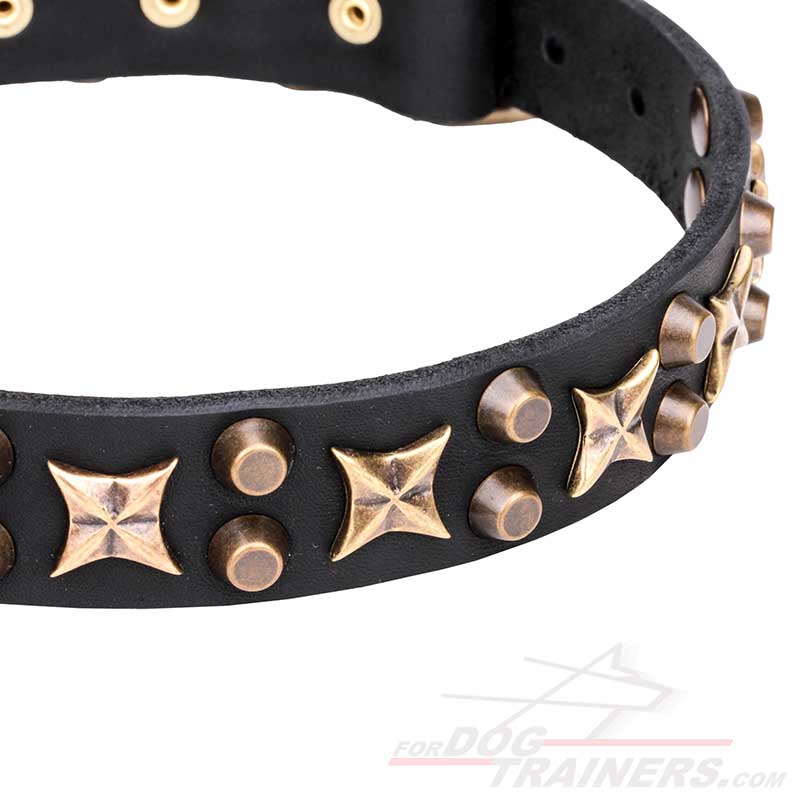 1 1/4 inch (30 mm) wide Leather Dog Collar with Old Bronze Plated Decorations