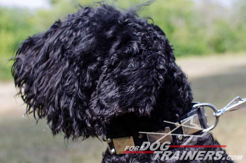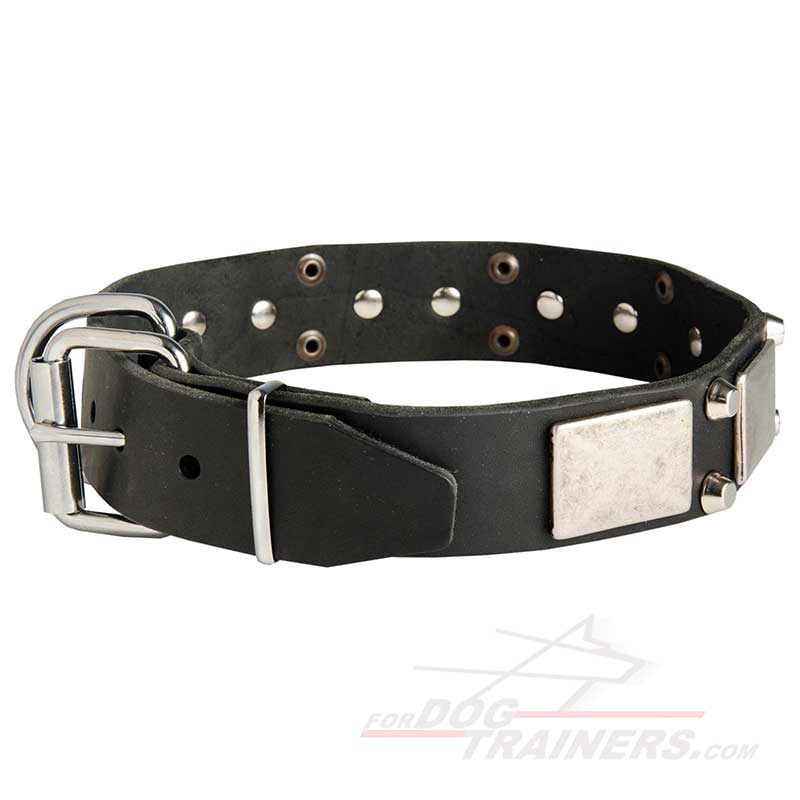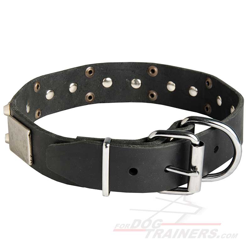 Leather Dog Collar for Black Russian Terrier with Nickel Plated Plates and Studs
