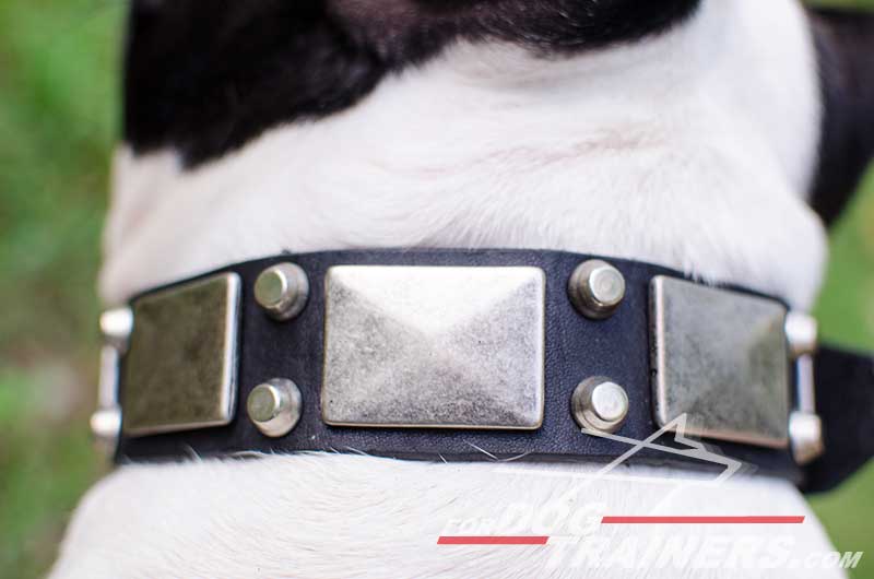 2 Rows of nickel plated pyramids, that are evenly arranged between the plates, look magnetic. Such designer decision makes this dog gear a fashionable dog supply that you can use both for everyday walking in style and for basic training.