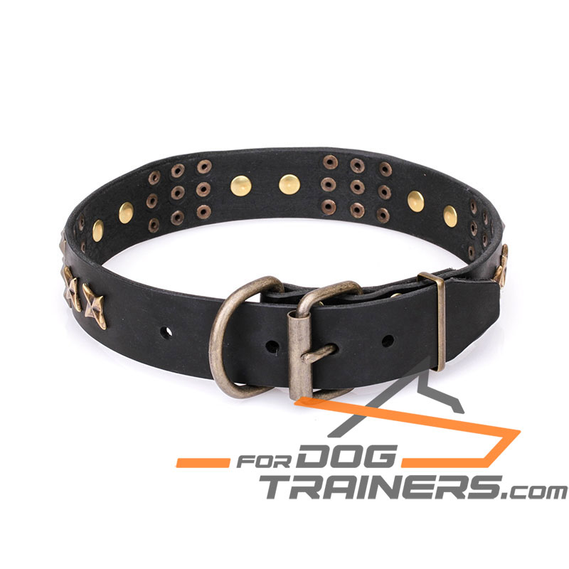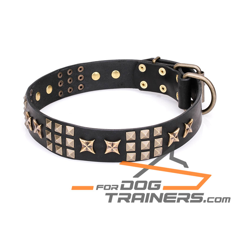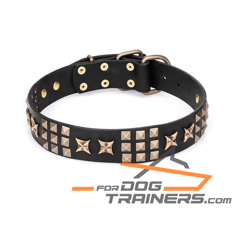 No more thriveless search for a proper dog collar! Learn more about this 1 1/2 inch (40 mm) wide leather accessory and you will see with your own eyes that this is the best choice for your strong canine. Large double stars and nine small pyramids of brass plated steel look stylish, posh and accentuate harsh nature of your dog. He may appear on an ordinary walk or you may train him basic obedience, in any case, your beloved pet will be up to the mark with this decorated leather dog collar on.