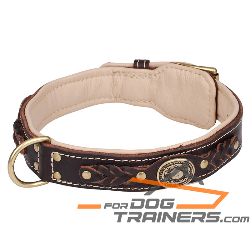 doesn't cut into your pet's skin. Genuine leather is safe to the dog's health. Moreover, the collar made of this stuff, is durable and strong. Stitched and braided, this accessory won't stretch and will gladden your eye with its beautiful look for ages. There is one more peculiarity this collar has - this is light Nappa padding. The contrast of colors creates a really impressive tool. Moreover, this padding helps to avoid rubbing.