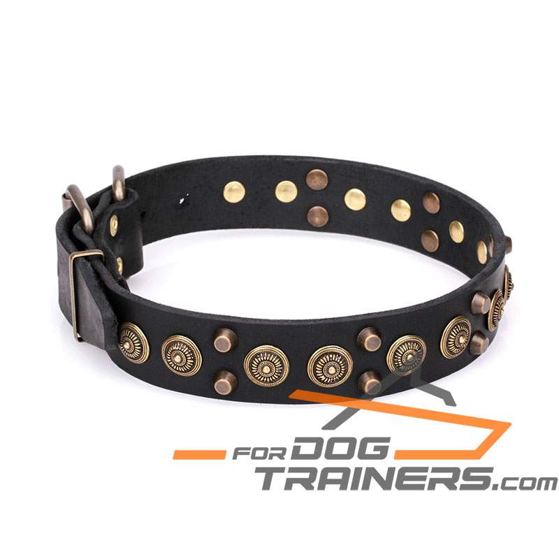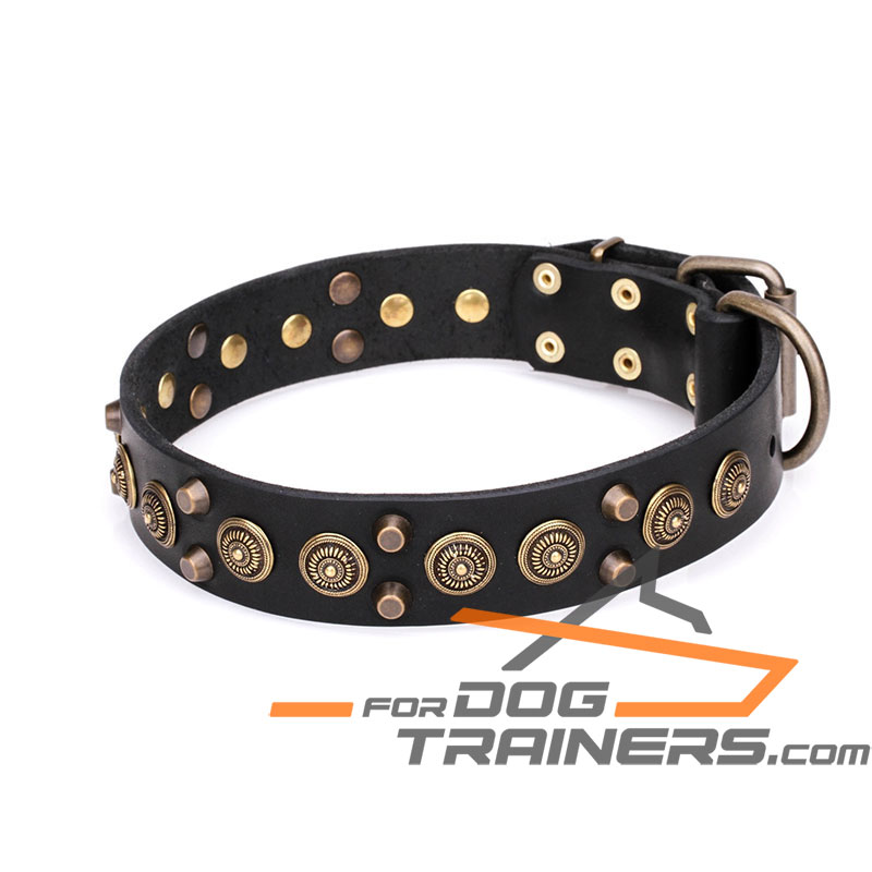 - The Collar is beautifully decorated with studs. There are two rows of brass plated pyramids and one row of large old bronze brooches. Such a combination makes the supply look unique and stylish as if it is a piece of jewelry.