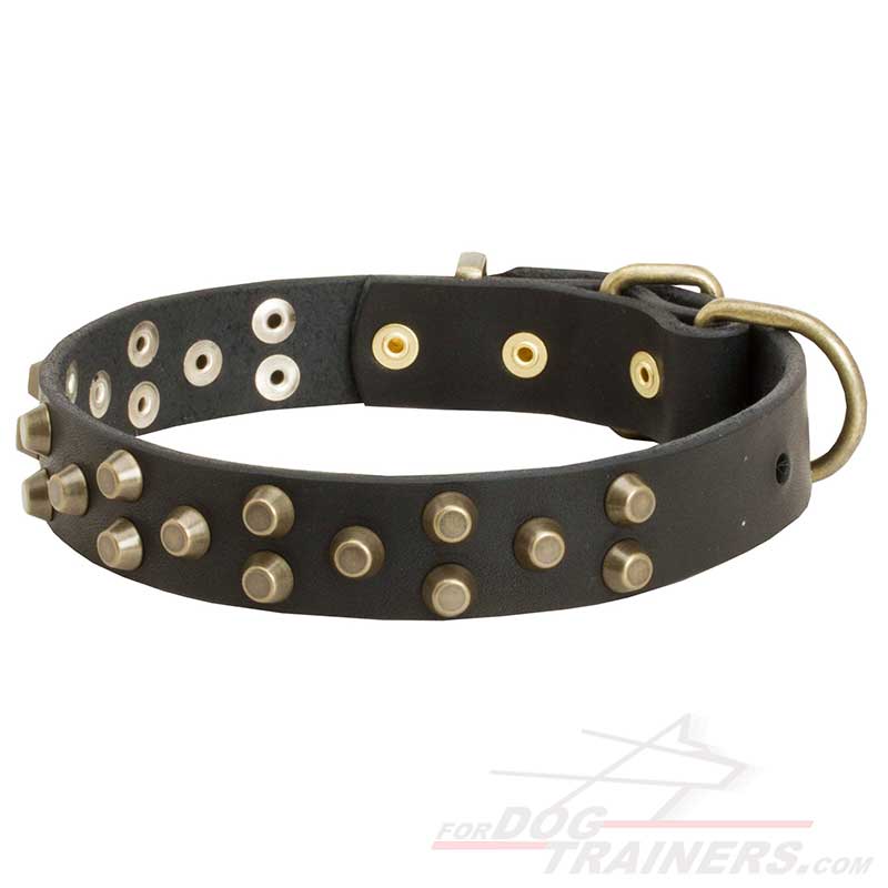 • Soft Comfortable Leather Dog Collar with Brass Pyramids - Fashion "Galaxy Trip" Walking Accessory