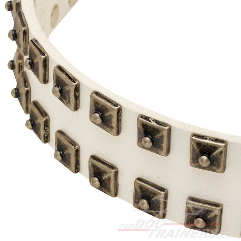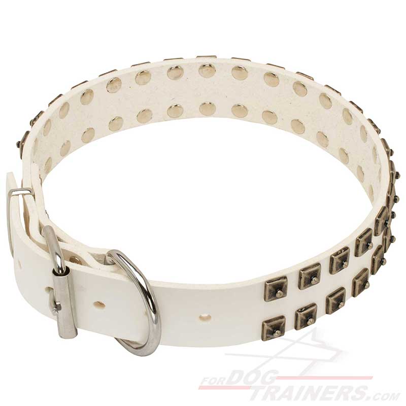 Try this White Leather Dog Collar with Dotted Square Studs and make your canine the most fashionable one in the neighbourhood. Since this product is perfect for walking and training, you can enjoy your dog's amazing look during the day. It is wide so it fits canines with large necks very well as it causes no choking. Besides, the dog will be really hard to tear it apart even if he pulls strongly.